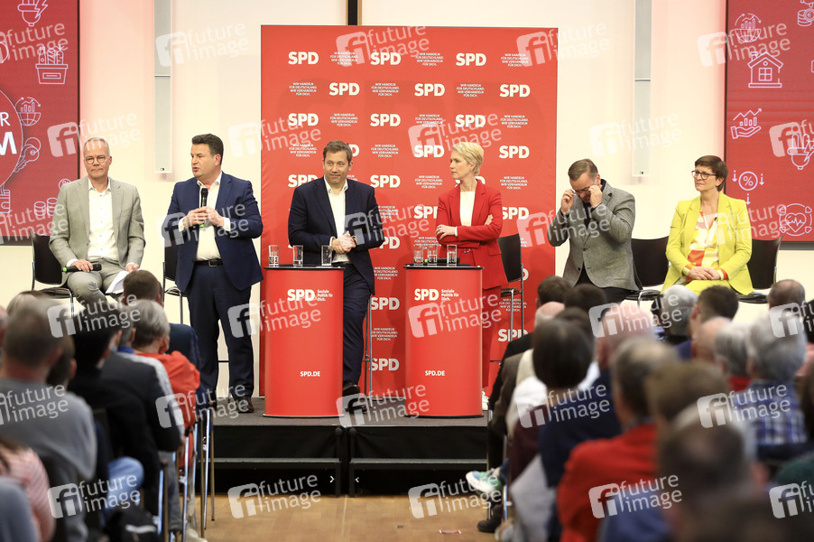 Matthias Miersch, Hubertus Heil, Lars Klingbeil, Manuela Schwesig, Boris Pistorius und Saskia Esken bei der Dialogkonferenz zum Start des SPD-Mitgliedervotum über den ausgehandelten Koalitionsvertrag der SPD mit CDU und CSU im Karriere-Campus Hannover. Hannover, 14.04.2025