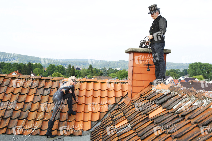 WORKING ART ist eine Bilderserie des Künstlers Jörg Düsterwald und des Fotografen Tschiponnique Skupin. Dabei werden Berufe mit der künstlerischen Bildsprache der Körpermalerei neu dargestellt. In den Schaffensprozess werden reale Unternehmen und authentische Locations eingebunden, um eine Symbiose zwischen Arbeitswelt und Kunst zu schaffen. Hier ein Shooting mit Model Randy als Catwoman und Schornsteinfeger Martin auf dem Dach eines Wohnhauses. Hameln, 15.07.2015