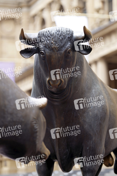 Bulle und Bär vor der Frankfurter Wertpapierbörse. Die Deutsche Börse hat im dritten Quartal unter anderem von den Turbulenzen am Strommarkt profitiert. Zudem zahlten sich zuletzt getätigte Übernahmen weiter aus. (Themenbild, Symbolbild) Frankfurt, 15.10.2021