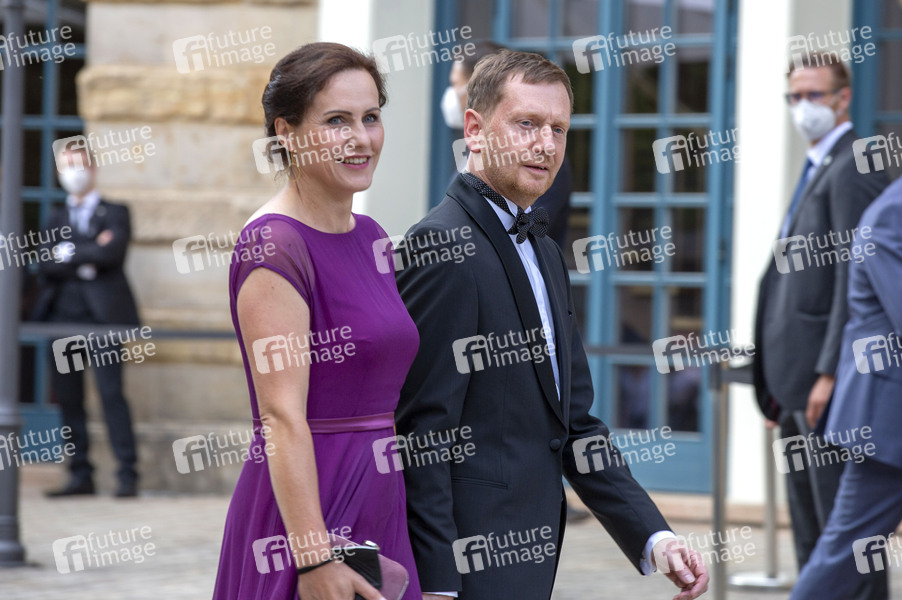 Michael Kretschmer mit Ehefrau Annett Hofmann bei der Eröffnung der Richard-Wagner-Festspiele 2021 mit der Premiere von Richard Wagners 'Der fliegende Holländer' im Bayreuther Festspielhaus. Bayreuth, 25.07.2021