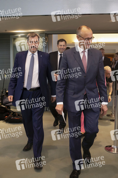Markus Söder, Lars Klingbeil und Friedrich Merz bei der Pressekonferenz nach der ersten Sitzung des Koalitionsausschusses von Union und SPD im Kanzleramt. Berlin, 28.05.2025