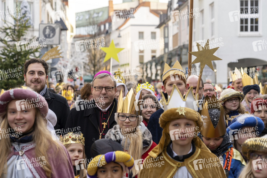 Sternsinger mit Bischof Franz-Josef Bode bei der bundesweiten Eröffnung der 62. Aktion Dreikönigssingen unter dem Motto 'Segen bringen, Segen sein. Frieden! Im Libanon und weltweit' vor dem Dom St. Peter. Osnabrück, 28.12.2019