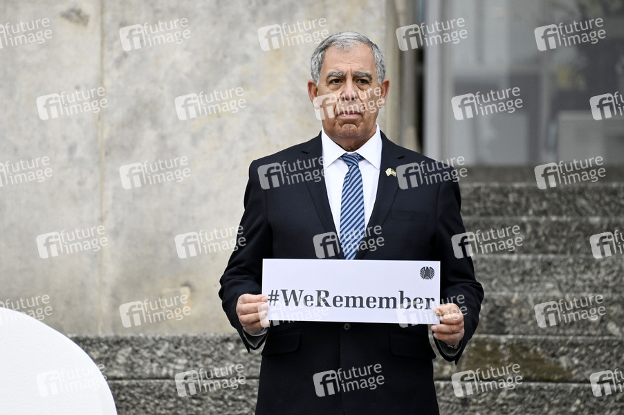 Mickey Levy bei den Pressestatements von Wolfgang Sobotka, Mickey Levy und Bärbel Bas am Schriftzug #WeRemember zur Erinnerung an die Millionen im Nationalsozialismus ermordeten Juden vor dem Reichstagsgebäude. Berlin, 25.01.2022