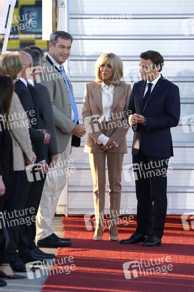 Markus Söder und Emmanuel Macron mit Ehefrau Brigitte Macron bei der Ankunft von Präsident Macron zum G7-Gipfel am Flughafen München Franz Josef Strauß. München, 25.06.2022