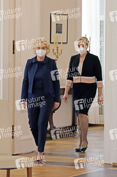 Christine Lambrecht und Franziska Giffey beim Bildtermin zur Aushändigung der Entlassungsurkunde an Franziska Giffey und Überreichung der Ernennungsurkunde an Christine Lambrecht durch den Bundespräsidenten im Schloss Bellevue. Berlin, 20.05.2021