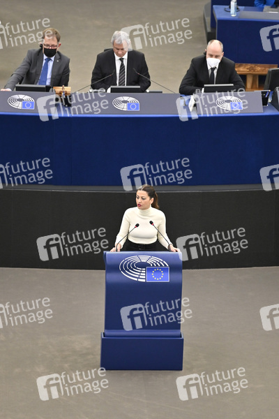 Sira Rego bei der Präsidentschaftskandidaten-Präsentation im Plenarsaal des Europäischen Parlaments. Straßburg, 18.01.2022