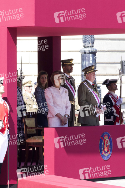 Die Königliche spanische Familie ehrt das Regimiento de Caballeria Acorazado Alcantara Nr.10 am Palacio Real, Madrid