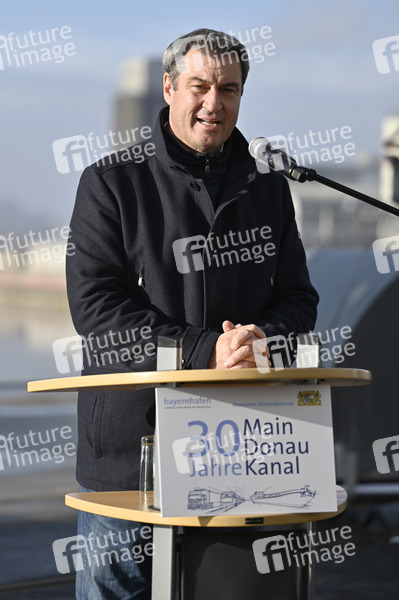 Markus Söder bei der Jubiläumsveranstaltung '30 Jahre Main-Donau-Kanal' am Bamberger Hafen. Bamberg, 25.11.2022