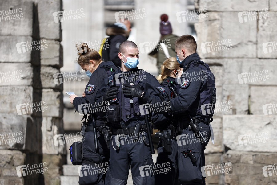 Am Rande einer unangemeldete Demo von Kritikern der Corona-Maßnahmen vor dem Kölner Dom führten Polizei und Ordnungsamt zahlreiche Kontrollen auf Einhaltung der Corona-Maßnahmen wie Mindestabstand und Maskenpflicht durch. Ab Montag will NRW wegen der steigenden Inzidenzzahlen noch strengere Corona-Regeln anwenden. Köln, 27.03.2021