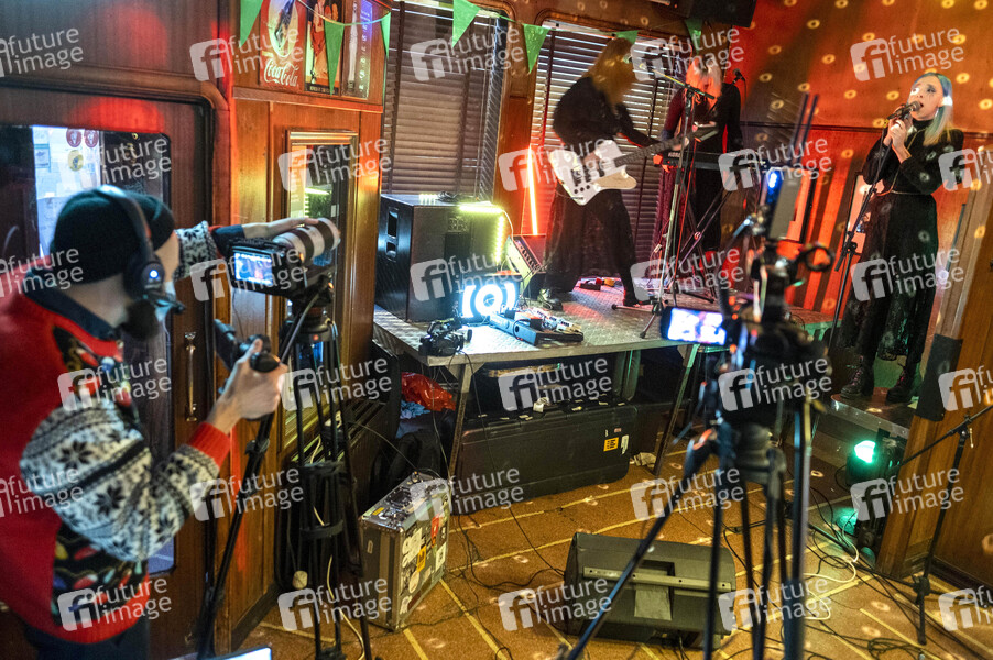 Margret Rosa Doru Harrysdottir, Solveig Matthildur Kristjansdottir und Laufey Soffia von Kaelan Mikla bei einem Online-Konzert aus dem geschlossenen Prikid Kaffihús. Da Bars ohne Speisezubereitung wegen der Corona-Pandemie geschlossen sein müssen, veranstaltet das Prikid Kaffihús regelmäßig Online-Konzerte mit bekannten isländischen Künstlern. Reykjavik, 20.12.2020