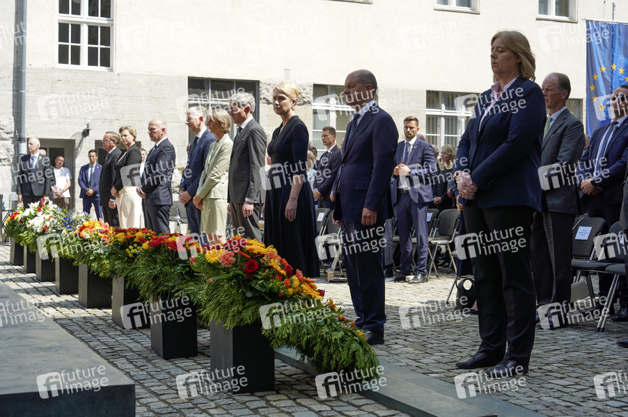 Boris Pistorius, Cornelia Seibeld, Kai Wegner, Robert von Steinau-Steinrück, Valerie Riedesel Freifrau zu Eisenbach, Stephan Harbarth, Manuela Schwesig, Olaf Scholz und Bärbel Bas bei der Gedenkveranstaltung zum 80. Jahrestag des Aufstands gegen Nationalsozialistische Gewaltherrschaft mit Kranzniederlegung auf dem Ehrenhof des Bendlerblocks.Berlin, 20.07.2024
