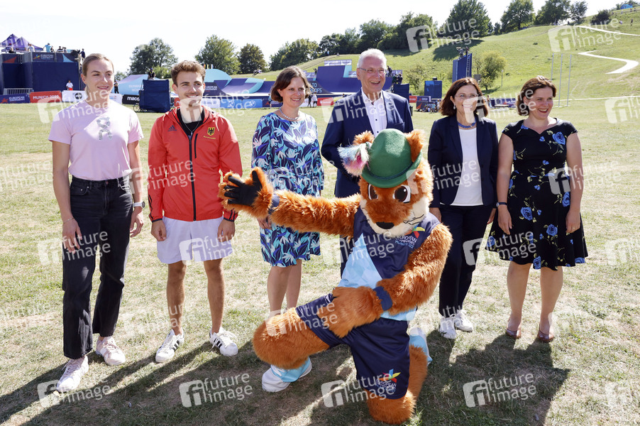 Alexandra Burghardt, Yannick Flohe, Juliane Seifert, Joachim Herrmann, Gfreidi, Marion Schöne und Verena Dietl bei der Pressekonferenz zur Eröffnung der 2. European Championships 2022 im Heimat Roof auf dem Olympiaberg. München, 10.08.2022