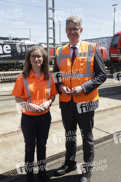 Sigrid Nikutta und Patrick Schnieder bei der Vorstellung der ersten Güterzuglokomotive, die für den automatisierten Streckenbetrieb umgerüstet wurde im DB Cargo-Werk Köln-Gremberg. Köln, 04.07.2025