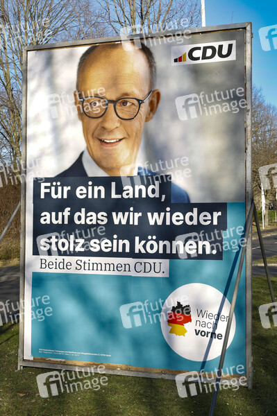 Beeinflussung der Wählerin, Botschaft, Bundestagswahl, Bundestagswahlen, Bundestagswahlkampf, Eigenwerbung, Kleinflächenplakat, Kampagne, Kandidat, Kandidaten, Kandidierende, Logo, Partei, Partei-Symbol, Parteien, Parteienwerbung, Parteilogo, Plakat, Plakatkampagne, Plakatständer, Politik, Politiker, Politikerinnen, Protestwähler, Slogan, Stammwähler, Wahl, Wahlbeeinflussung, Wahlbeteiligung, Wählen, Wählerschicht, Wählerschichten, Wahlkampagne, Wahlkampf, Wahlkampfmodus, Wahlkandidat, Wahlprogramm, Wahltermin, Wahlwerbung, Wirkung, Wirkungsmacht, Christlich Demokratische Union Deutschlands, CDU, Friedrich Merz, Symbolbild, Symbolfoto, Themenbild, Themenfoto