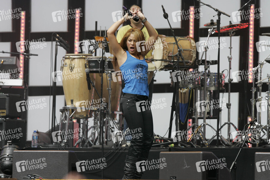 Shakira auf dem Live Earth Konzert in der Hamburger HSH-Norbank-Arena. Die weltumspannende Konzertreihe fand auf sieben Kontinenten insgesamt 24 Stunden lang statt. Ins Leben gerufen vom ehemaligen US-Vizepräsidenten und Umweltaktivisten Al Gore und vom Musikproduzenten Kevin Wall, die damit auf die Klimaerwärmung aufmerksam machen wollten.