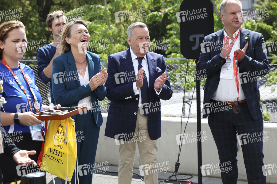Elke Büdenbender, Roland Kaiser und Dirk Hilbert bei der Abschlussveranstaltung der 25. World Transplant Games 2025 im Heinz-Steyer-Stadion. Dresden, 23.08.2025