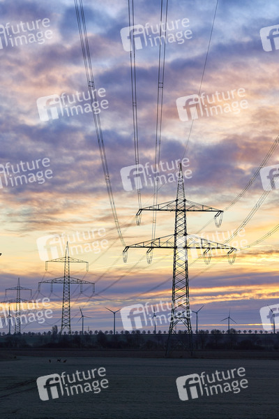 Strommasten und Windräder bei Sonnenaufgang. Gleidingen, 20.03.2021