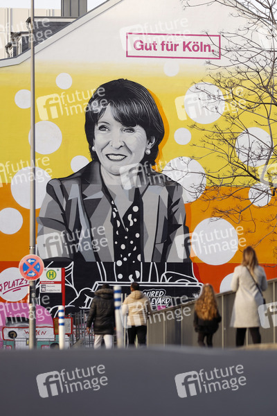 Politikerin, Wandbild, Konterfei, Gesicht, Gemälde, Wahl, Köln, Oberbürgermeisterin von Köln, parteilos, Kandidatin, Wiederwahl, Amtsperiode, Idealisierung, Portrait, Wandgemälde, Propaganda, politische Kunst, Lokalpolitik, Kommunalpolitik, Symbolbild, Symbolfoto
