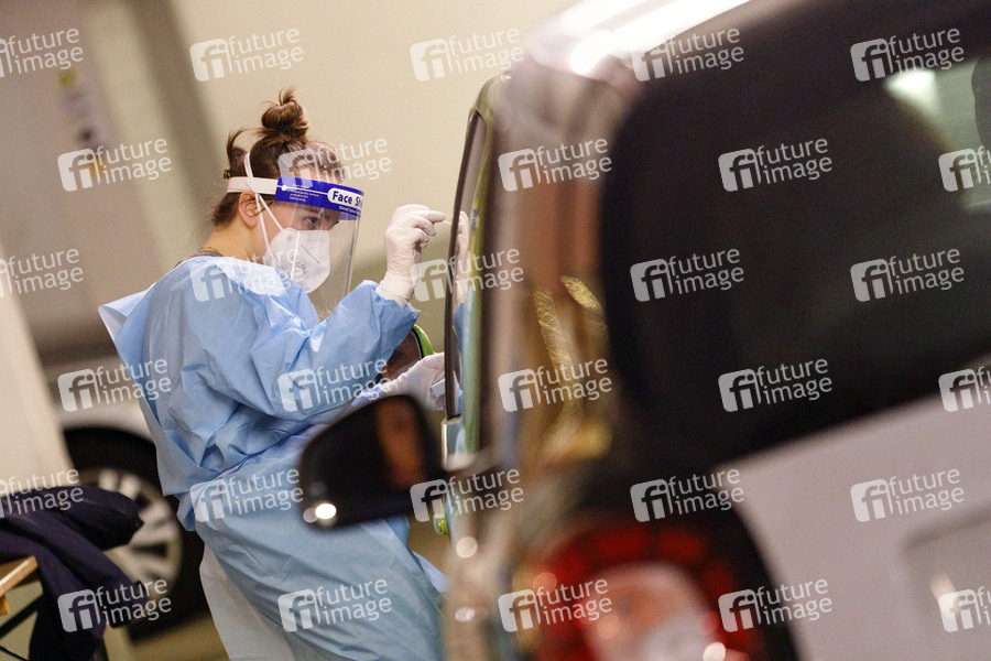Mit dem 'Bürgertest' haben alle Einwohner Deutschlands die Möglichkeit, sich kostenlos auf eine Infektion mit dem Corona-Virus testen zu lassen. Die Drive-in-Teststation an der Lanxess-Arena bietet diese Möglichkeit jetzt ohne Begrenzung an. (Symbolbild, Themenbild) Köln, 15.04.2021