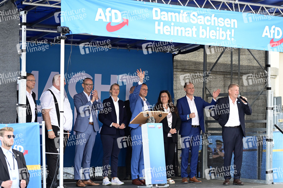 Ralf-Peter Hechtberger, Timo Schreyer, Jörg Urban, Alice Weidel, Tino Chrupalla, Doreen Schwietzer, Frank Peschel und Karsten Hilse bei einer Wahlkampfveranstaltung der AfD zur Landtagswahl in Sachsen auf dem Kornmarkt. Bautzen, 27.08.2024
