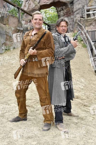 Sascha Gluth und Joshy Peters bei der Pressekonferenz der Karl-May-Spiele 2022 mit ersten Szenen aus 'Der Ölprinz' im Freilichttheater am Kalkberg. Bad Segeberg, 17.06.2022