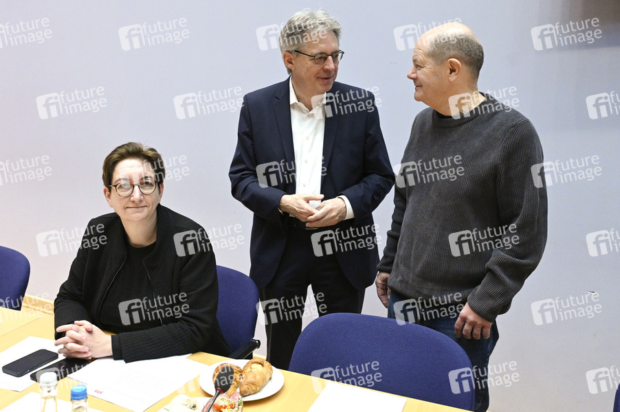 Klara Geywitz und Olaf Scholz bei Beratungen im Rahmen einer Klausur des SPD-Parteivorstandes in der Landesvertretung Hamburg beim Bund. Berlin, 16.03.2024