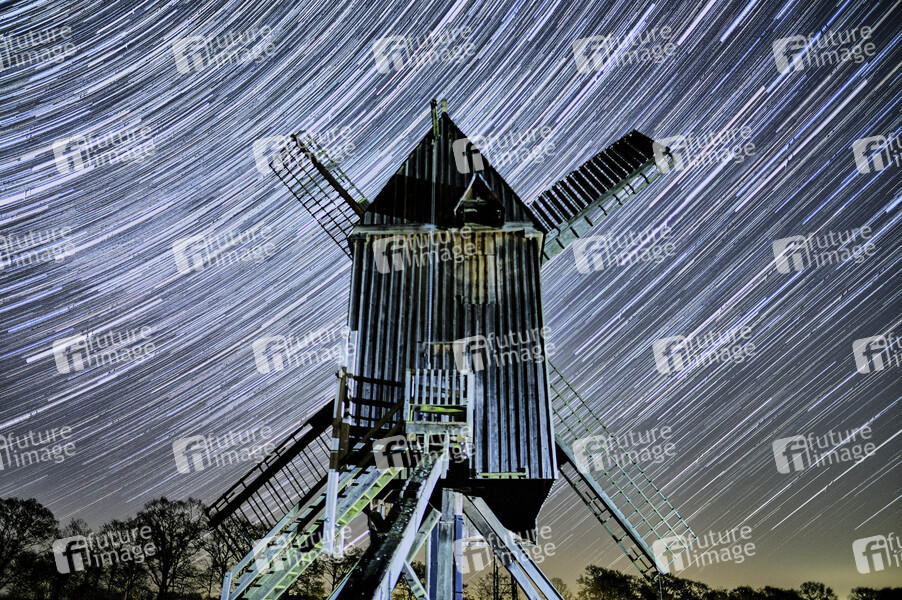 Sehenswürdigkeit, Sightseeing, Mühle, Windmühle, funktionsfähiges kulturhistorisches Denkmal, Ständermühle, Kastenmühle, Mühlenhaus, Hausbaum, technisches Bauwerk, Flügle, Windmühlenflügel, Windenergie, Energieumwandlung, Nacht, Sterne, Sternenhimmel