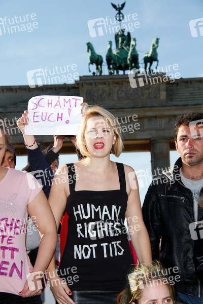 Flüchtlinge und Aktivisten, die vor dem Brandenburger Tor für eine neue Asylpolitik demonstrieren, werden von Politkerinnen der Piratenpartei unterstützt, Berlin