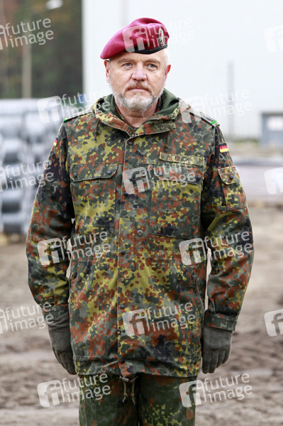 Oberst Klaus Finck beim Pressetermin zum Bau eines festen Zauns an der Restriktionszone zur Eindämmung der Afrikanischen Schweinepest im Truppenlager Werdeck. Krauschwitz, 11.11.2020