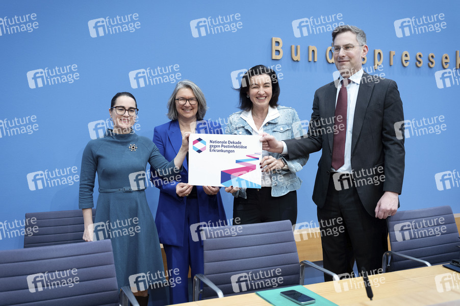 Maria Vehreschild, Annette Peters, Dorothee Bär und Ralf Heyder bei der Bundespressekonferenz 'Nationale Dekade gegen Postinfektiöse Erkrankungen' im Haus der Bundespressekonferenz. Berlin, 30.01.2026