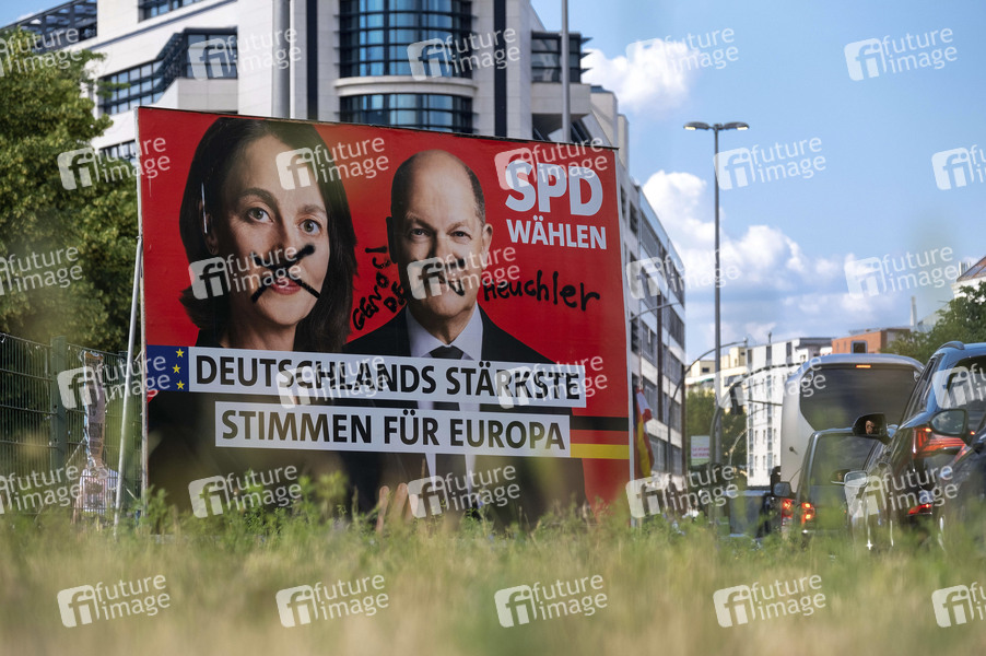 Beschmiertes Wahlplakat der SPD für die bevorstehenden Wahlen zum Europäischen Parlament in Kreuzberg. Berlin, 01.06.2024