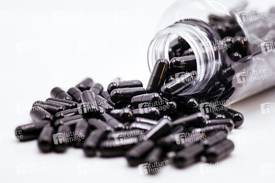 Schwarze Pillen mt Pillenflasche. Köln, 08.05.2019