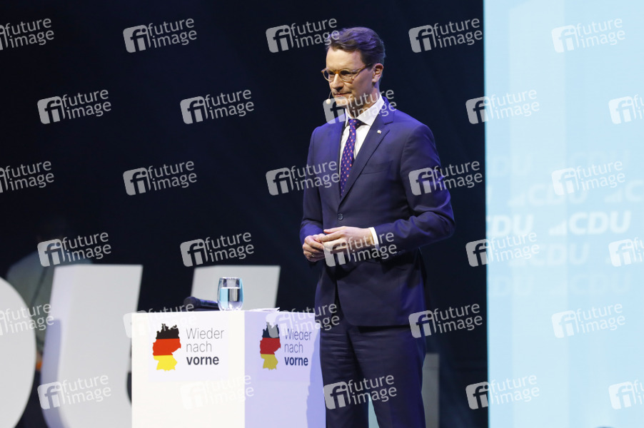 Hendrik Wüst bei einer Wahlkampfveranstaltung der CDU zur Bundestagswahl 2025 in der Rudolf-Weber-Arena. Oberhausen, 21.02.2025
