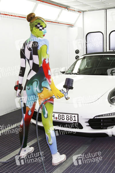 Bodypainting Meets Business, Body-Painting, Erotik, Frau, Mädchen, nackt, Akt, weiblich, Körperkunst, Körperfarben, Farbe, Bemalung, Kunst, Malerei, Fotografie, Beruf, Lackierer, Werkstatt, Auto, Porsche 911 Carrera S, Joerg Dewaldo Duesterwald, body painting, erotic, woman, girl, nude, female, body art, colors, photography, profession, occupation, refinisher, workshop, car sprayer