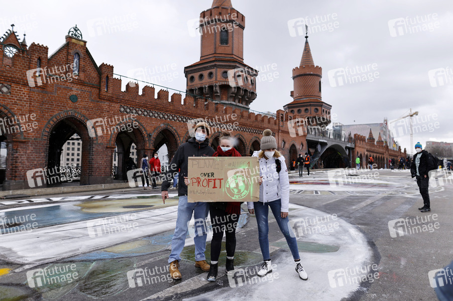 Am Freitag finden mehrere Demonstrationen zum globalen Klimastreik von Fridays for Future in Berlin statt. An der Oberbaumbrücke bemalen Aktivisten die Straße zum Thema 'Another World is possible'. Berlin, 19.03.2021
