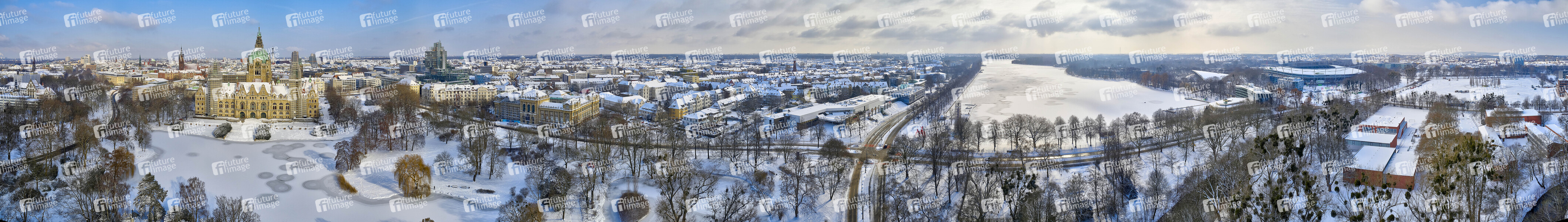 Luftbild vom verschneiten Maschpark mit dem Neuen Rathaus und dem Maschsee im Winter. (Der Drohnenflug wurde ordnungsgemäß bei der Polizei Leitstelle Hannover angemeldet) Hannover, 09.02.2021