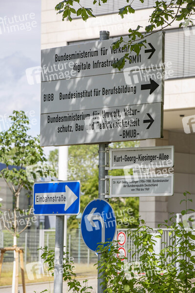 Hinweisschild Bundesministerien im Bundesviertel. Am 20. Juni 1991 verkündete die damalige Bundestagspräsidentin Rita Süssmuth in der Plenarsitzung im alten Wasserwerk die Entscheidung zum Umzug von Parlament und Regierung nach Berlin. Bis 1990 war Bonn die Hauptstadt der Bundesrepublik Deutschland und bis 1999 Regierungssitz. Seit 1951 ist Bonn ein Sitz der Vereinten Nationen. Heute ist Bonn der zweite Regierungssitz. Bonn, 20.06.2021