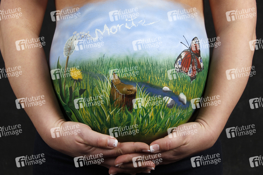 Bodypainting, Erotik, Frau, Mann, fast nackt, drinnen, weiblich, männlich, Körperkunst, Kunst, Malerei, Paar, schwanger, Bauch, erotic, woman, man, nude, indoor, female, body art, body painting, pregnant, couple