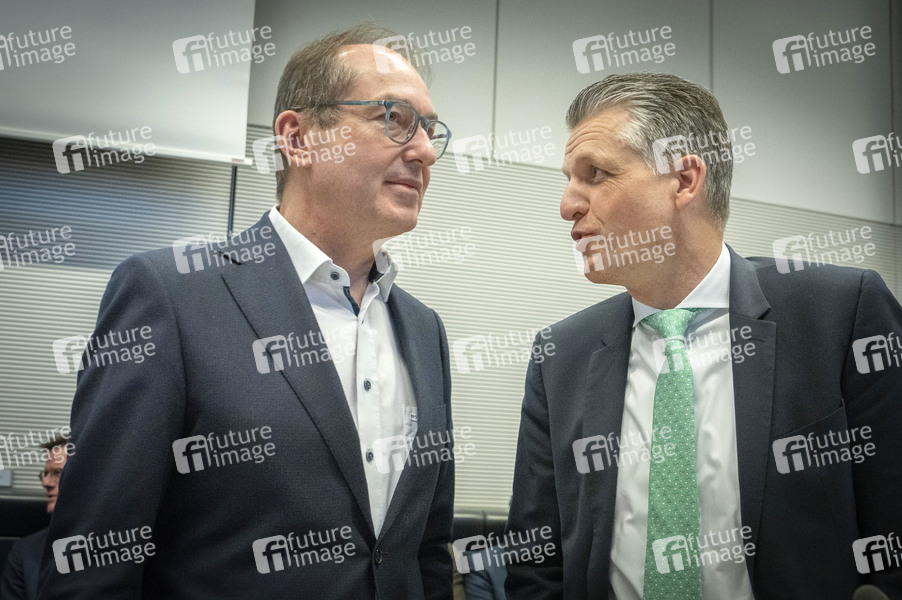 Alexander Dobrindt und Thorsten Frei in der Fraktionssitzung der CDU/CSU-Bundestagsfraktion im Reichstagsgebäude. Berlin, 10.02.2025