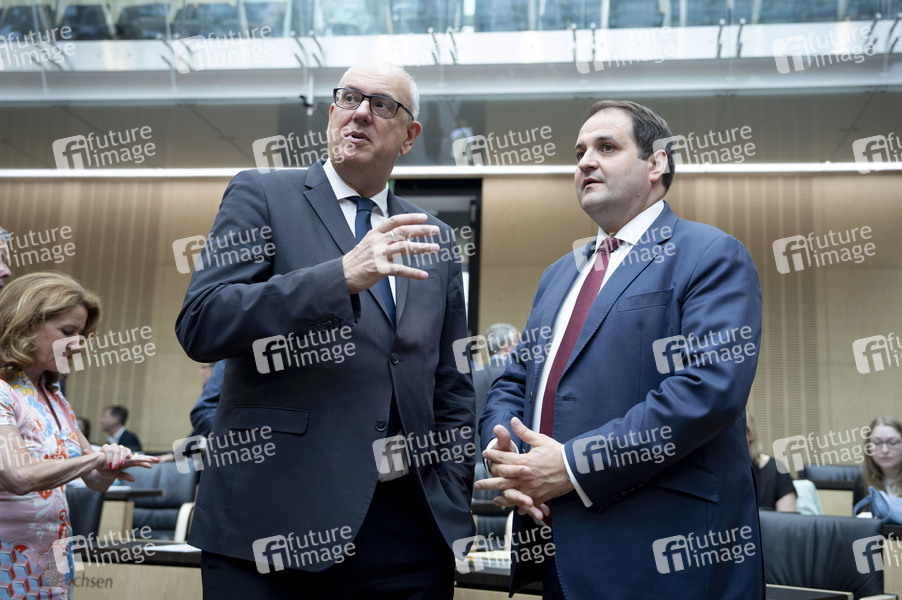 Andreas Bovenschulte und Nathanael Liminski beim Pressestatement am Rande der 1056. Sitzung des Bundesrates im Plenarsaal des Preußischen Herrenhauses. Berlin, 11.07.2025