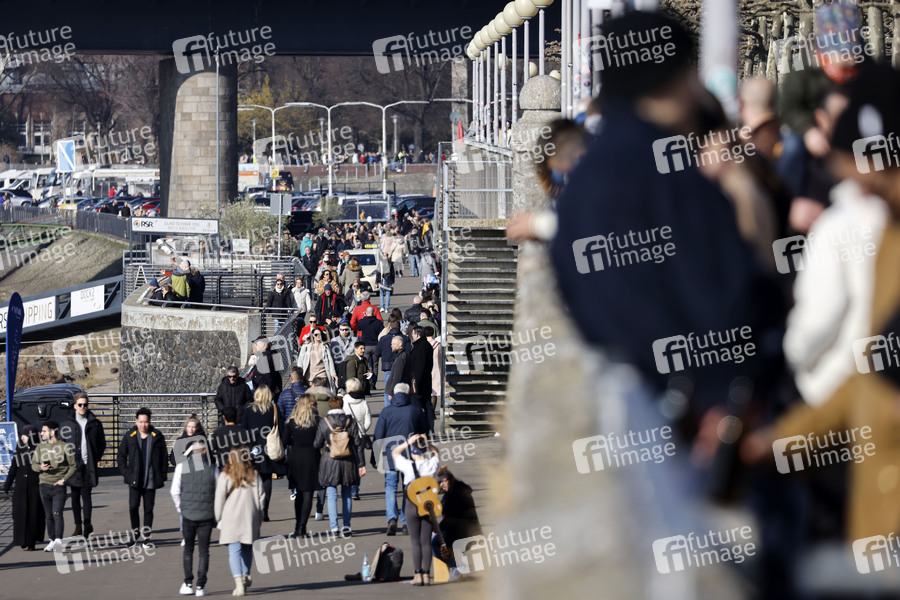 Tausende Passanten genießen die Sonnenstrahlen an der Rheinuferpromenade in Düsseldorf. Ungeimpfte können wieder mit negativem Coronatest in die Gastronomie in der Altstadt (3G). Düsseldorf, 05.03.2022