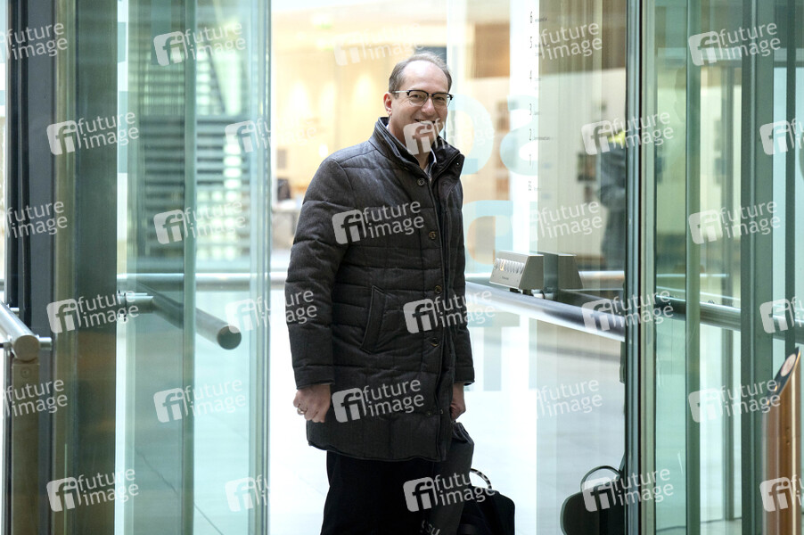 Alexander Dobrindt beim gemeinsamen Auftaktstatement der Parteivorsitzenden von CDU, CSU und SPD zur Bildung einer neuen Regierungskoalition im Willy-Brandt-Haus. Berlin, 28.03.2025