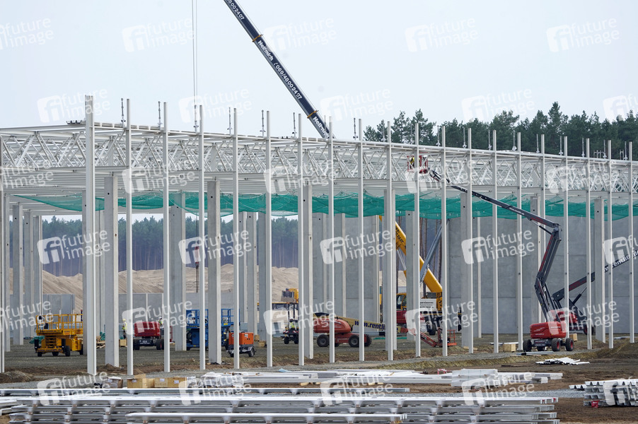 Tesla, Elektroauto, Elektrofahrzeuge, PKW, Auto, Model Y, Model 3, Großfabrik, Automobilhersteller, Baustelle, Bauen, Baubranche, Bau-Branche, Bauarbeiter, Bauarbeiten, Großbaustelle, Kran, Kräne, Baustelle