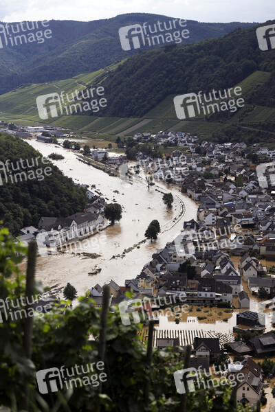 In der Eifel haben heftige Regenfälle und Dauerregen für Überschwemmungen und Überflutungen gesorgt. Im Ahrtal trat der Fluss vielerorts über die Ufer und überschwemmte nicht nur Keller sondern ganze Ortschaften. Im Bild der Ort Dernau (Landkreis Ahrweiler), der beinahe komplett von den Wassermassen geflutet wurde. Viele Menschen verloren alles. Dernau, 15.07.2021