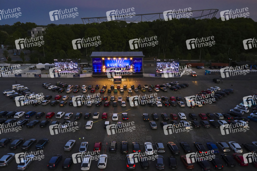 Sänger, Musiker, Rap, Hip Hop, Prominenz, Celebrity, Celebrities, Auftritt, Bühne, Stage, live, Unterhaltung, Entertainment, Kultur, Corona, Sars-CoV-2, Covid-19, Coronavirus, Coronakrise, Corona-Krise, Corona-Pandemie, Coronamaßnahmen, Corona-Schutz, Kontaktverbot, Mindestabstand, Social Distancing, Abstand, Abstandhalten, Abstandsregel, Auto, Autokonzertreihe, Luftaufnahmen, Luftbild