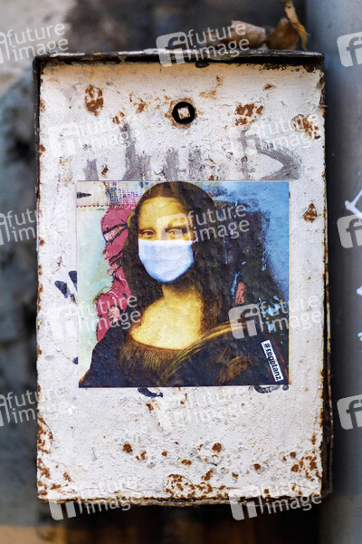 Die Kölner Künstlerin Ursula Düster hat einen Sticker mit der Kölschen Mona Lisa mit Mundschutz entworfen, der Aufkleber hängt an 60 Standorten in Köln anlässlich der Coronakrise. Köln, 31.10.2020