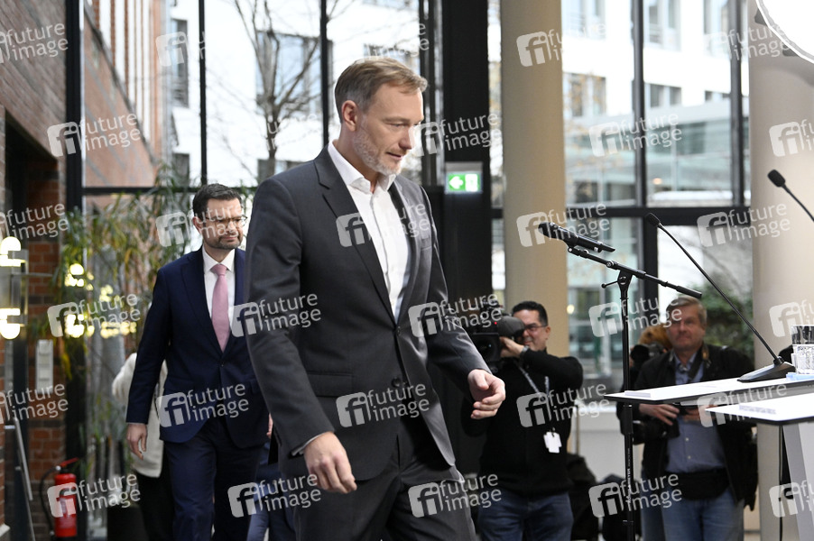 Marco Buschmann und Christian Lindner bei der Presseskonferenz der FDP zur Vorstellung des neuen Generalsekretärs Marco Buschmann im Hans-Dietrich-Genscher-Haus. Berlin, 02.12.2024