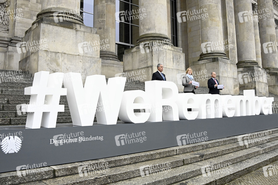 Mickey Levy, Bärbel Bas und Wolfgang Sobotka bei den Pressestatements von Wolfgang Sobotka, Mickey Levy und Bärbel Bas am Schriftzug #WeRemember zur Erinnerung an die Millionen im Nationalsozialismus ermordeten Juden vor dem Reichstagsgebäude. Berlin, 25.01.2022