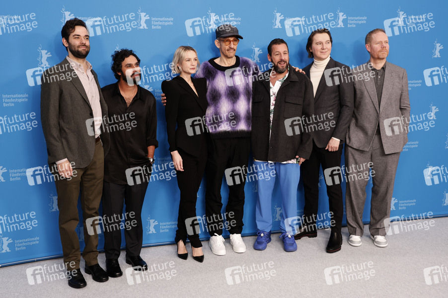 Michael Parets, Kunal Nayyar, Carey Mulligan, Johan Renck, Adam Sandler, Paul Dano und Max Richter beim Photocall zum Kinofilm 'Spaceman' auf der Berlinale 2024 / 74. Internationale Filmfestspiele Berlin im Hotel Grand Hyatt. Berlin, 21.02.2024