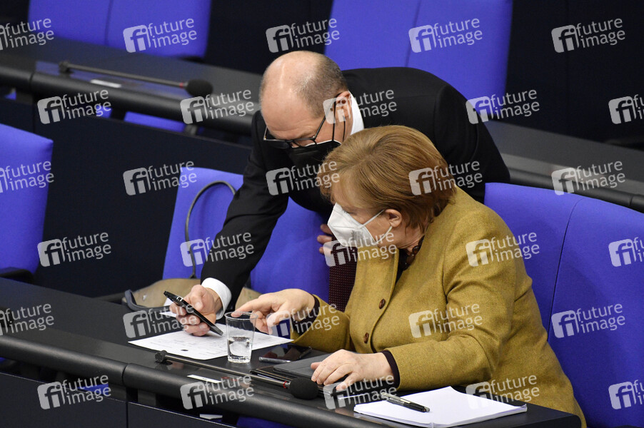 Olaf Scholz und Angela Merkel in der 209. Sitzung des Deutschen Bundestages im Reichstagsgebäude. Berlin, 11.02.2021